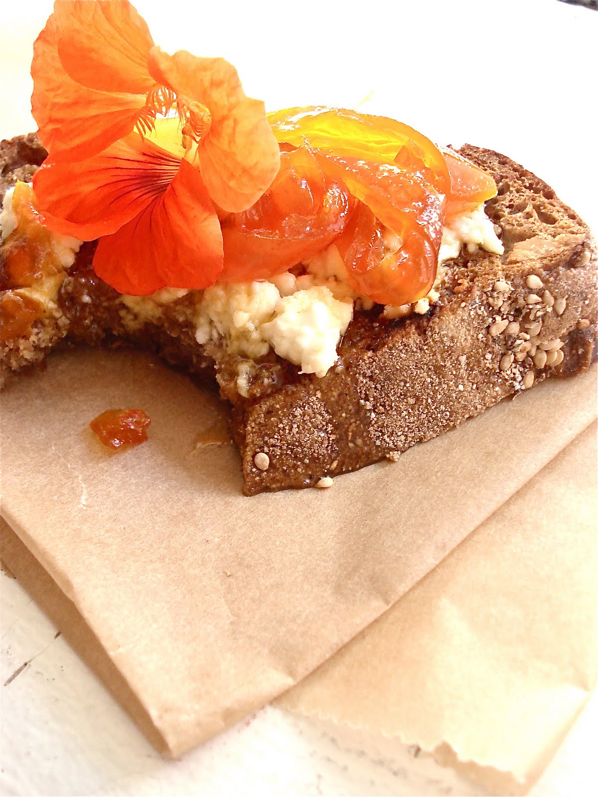 Instead the blossoms work much better on top, with the sweet jam and salty feta cheese underneath. This lets nasturtiums shine as nature intended, as they are mildly peppery themselves. Arugula would probably work equally as well in this supporting roll.